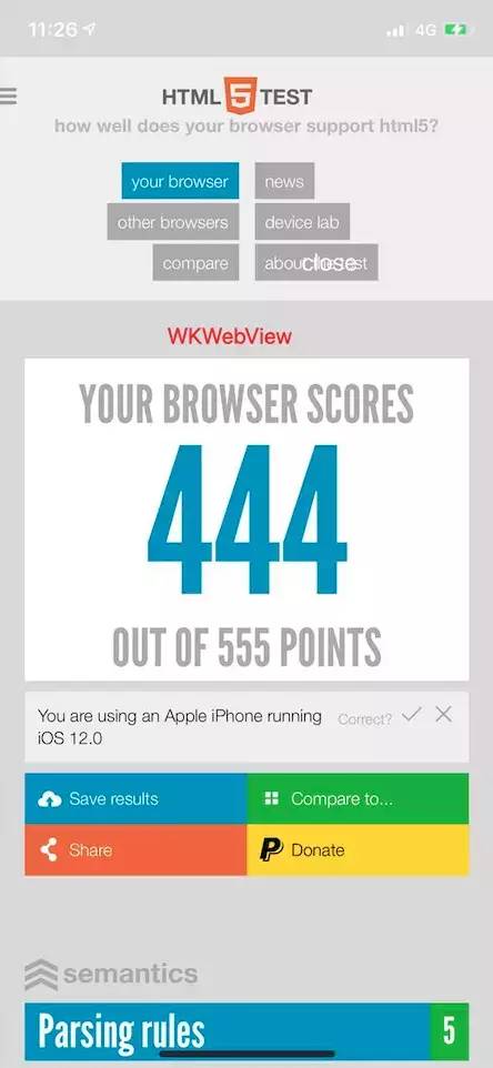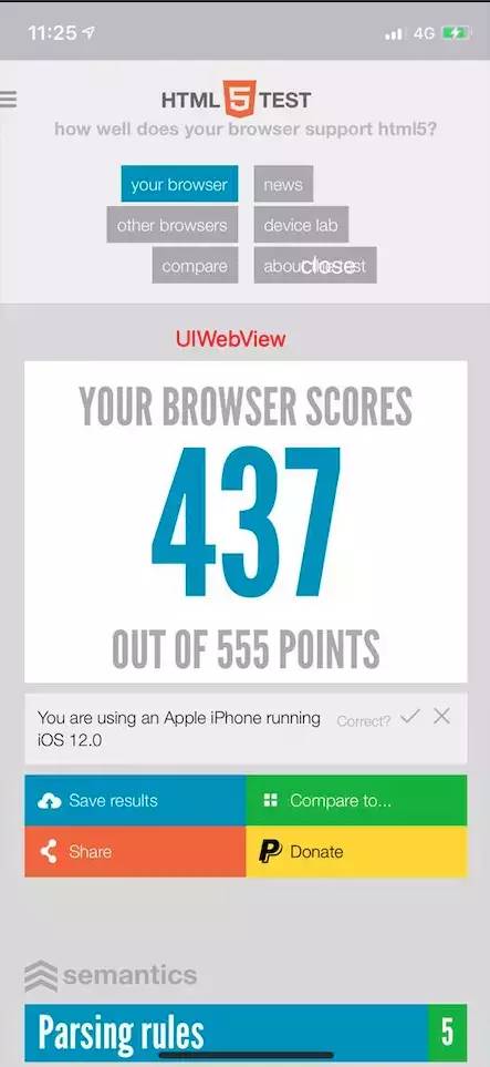 因为 flutter 里使用的就是 WK,所以和原生的 WKWebView 一样都是 444 分,比 UIWebView 的 437 略胜一筹。