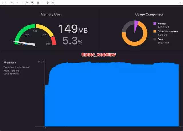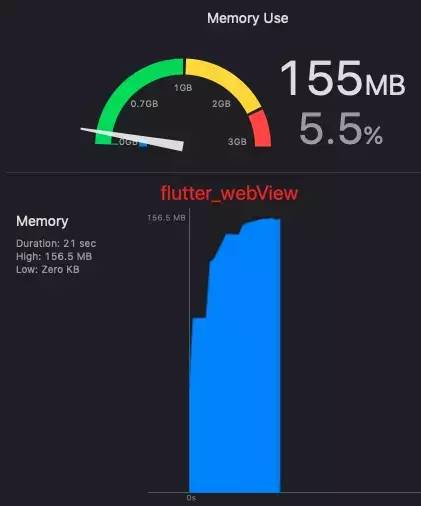 从图上可以看出,WKWebView 在内存方面有很大的优势啊,UIWebView 的内存是真的伤啊,然后 debug 看了一下 flutter_webView,他使用的就是原生的 webView。