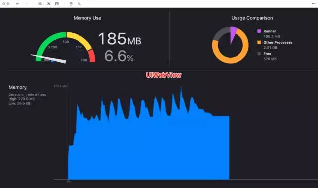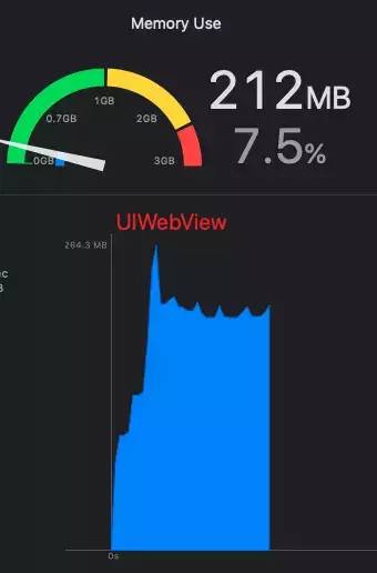 他相比较原生 WKWebView 的内存开销稍大一点,从测试表现来看,一般大个 30 MB 左右。