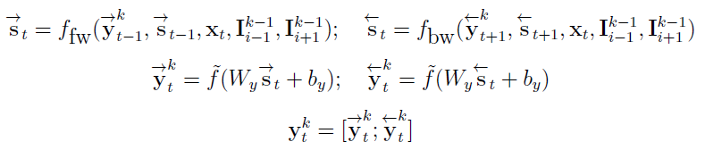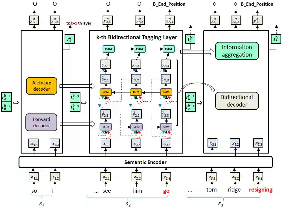 对于多层双向打标器,它的结构主要约束包括:(1)信息传递只发生在相邻句子间;(2)当前句子中的所有token可见跨句信息是相同的;(3)随着层数增加,较远距离的句子信息可被当前句子获取到;(4)每层的双向打标器都由一个双向解码器和一个信息整合层构成。对于第k层事件标签向量信息计算方法为: