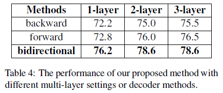 模块剖析进一步了验证双向解码器和信息整合层的作用。具体而言,双向解码器较之于单向方法显著更优;层数增加情况下,不同解码机制下的效果都能得到提升;不同信息整合机制也能引起一定表现变动。