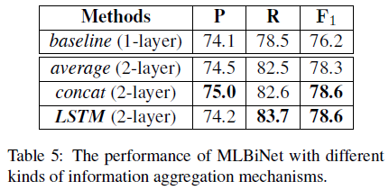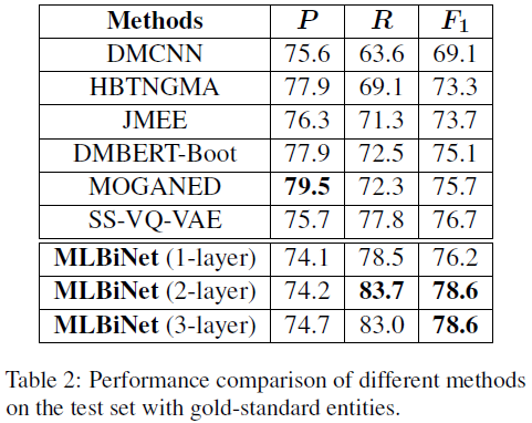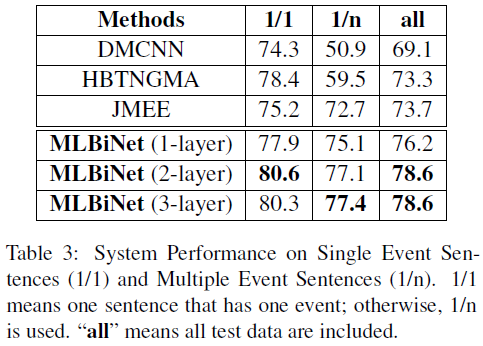 我们在ACE05数据集上进行了试验,如下两个表所示,我们的方法在不同维度都能取得较好的效果。双向解码器有效,它在1层时较之于HBTNGMA更优;跨句信息整合有意义,多层网络下,我们的方法在单事件句子和多事件句子的抽取效果都得到提升。