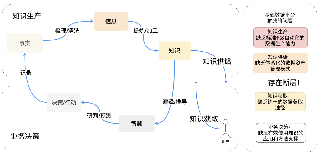 答:首先我们通过埋点采集得到原始的事实(实时数据),从事实中梳理清洗得到信息(明细),随后通过定义和加工融合各类维度(维度),能得到对应的知识(业务指标)。而用户通过各类途径获得到指标后,通过演绎推导等方法,预测业务的发展,然后并做出下一步的决策。