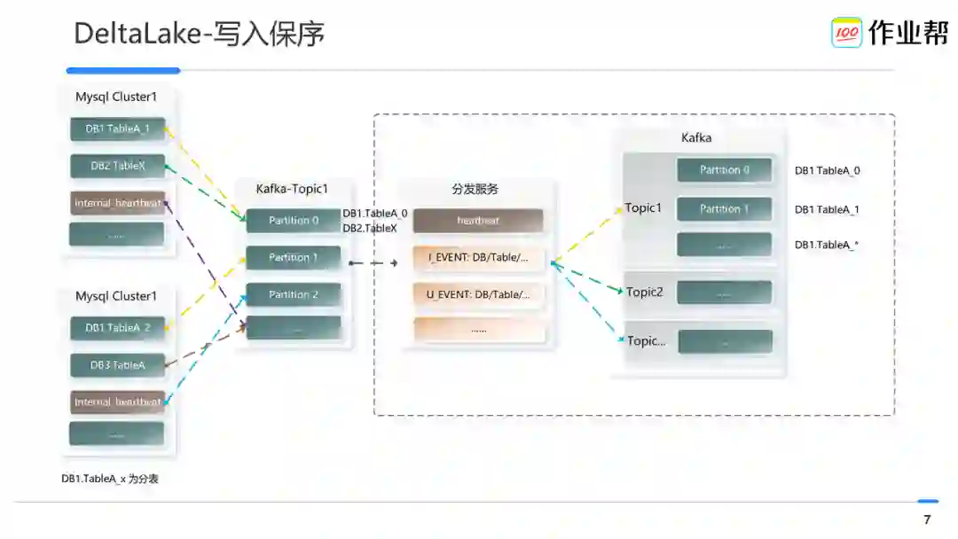 保障分库分表,甚至不同分表在不同集群的情况下,数据写入到 Kafka 后的有序性。即写入 Delta Lake 的 spark 从某个 topic 读取到逻辑表的数据是 partition 粒度有序的。