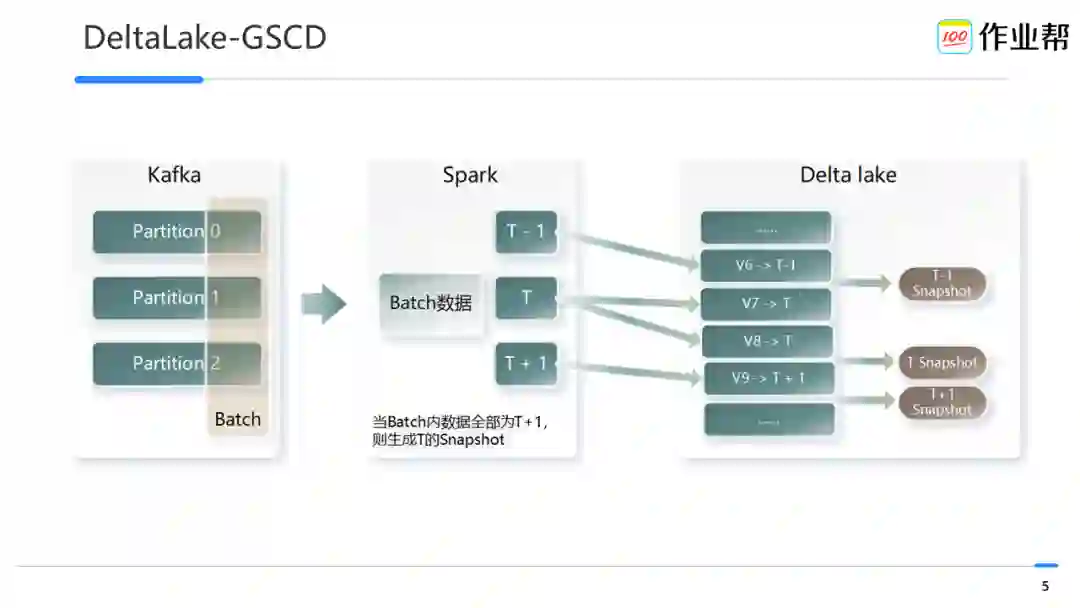 当 Spark 读取某一个 batch 数据后,根据上述表元数据使用数据中的 event time 生成对应的 dt 值,如数据流中 event time 的值均属于 T+1,则会触发生成数据版本 T 的 snapshot,数据读取时根据 snapshot 找到对应的数据版本信息进行读取。