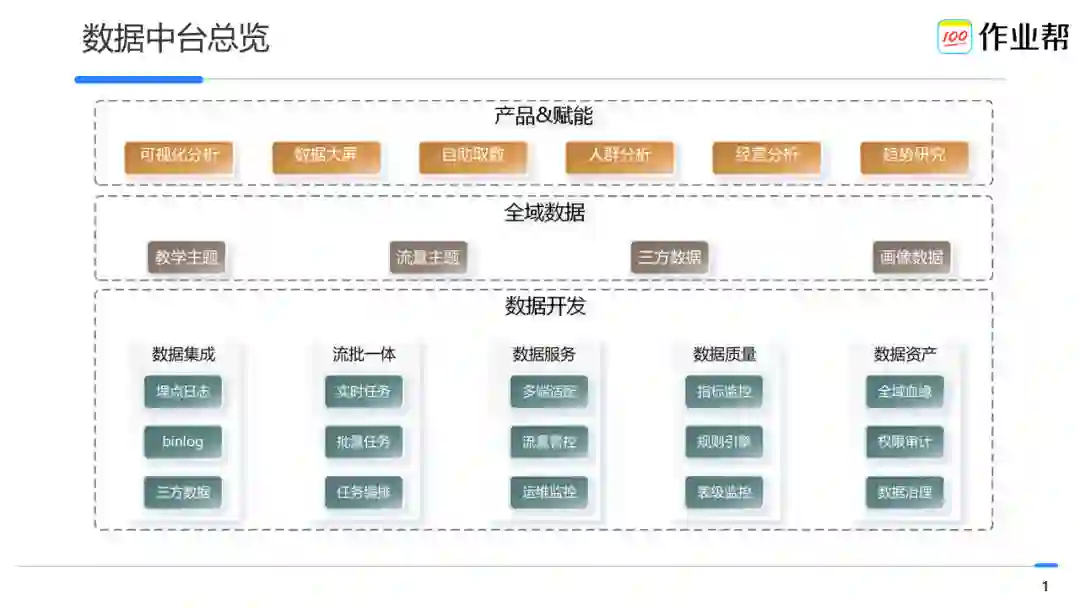 上图为作业帮数据中台总览。主要分为三层:
