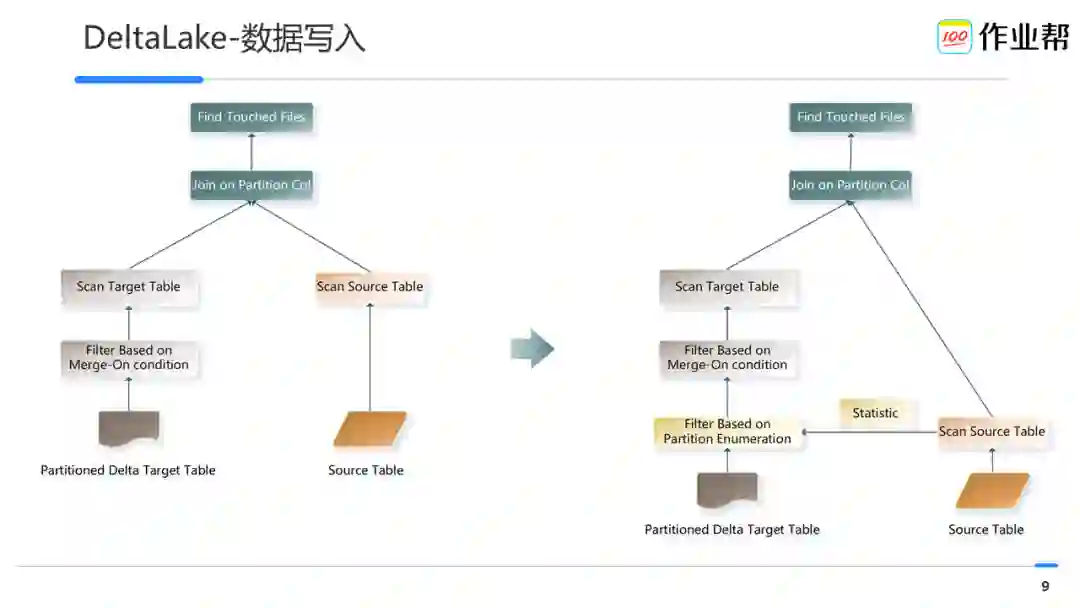 针对这种场景,对 Delta Lake 做了升级:使用 DPP 做分区剪枝来优化 megre into 的性能,如上右图所示: