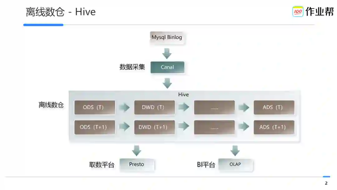 作业帮是一家以科技为载体的在线教育公司。目前旗下拥有工具类产品作业帮、作业帮口算,K12 直播课产品作业帮直播课,素质教育产品小鹿编程、小鹿写字、小鹿美术等,以及喵喵机等智能学习硬件。作业帮教研中台、教学中台、辅导运营中台、大数据中台等数个业务系统,持续赋能更多素质教育产品,不断为用户带来更好的学习和使用体验。其中大数据中台作为基础系统中台,主要负责建设公司级数仓,向各个产品线提供面向业务主题的数据信息,如留存率、到课率、活跃人数等,提高运营决策效率和质量。