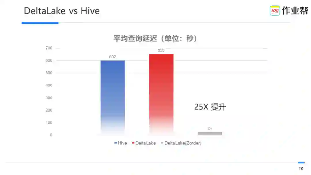 我们使用同样的数据(200 亿 +),使用 Hive 计算,平均延迟 10min+,而使用 Delta Lake 后,平均延迟居然高达~11mins+。分析后发现主要是没有对筛选列使用 Zorder 排序,当开启 Zorder 后,延迟则降低到了~24s,提高了近 25X 性能。、