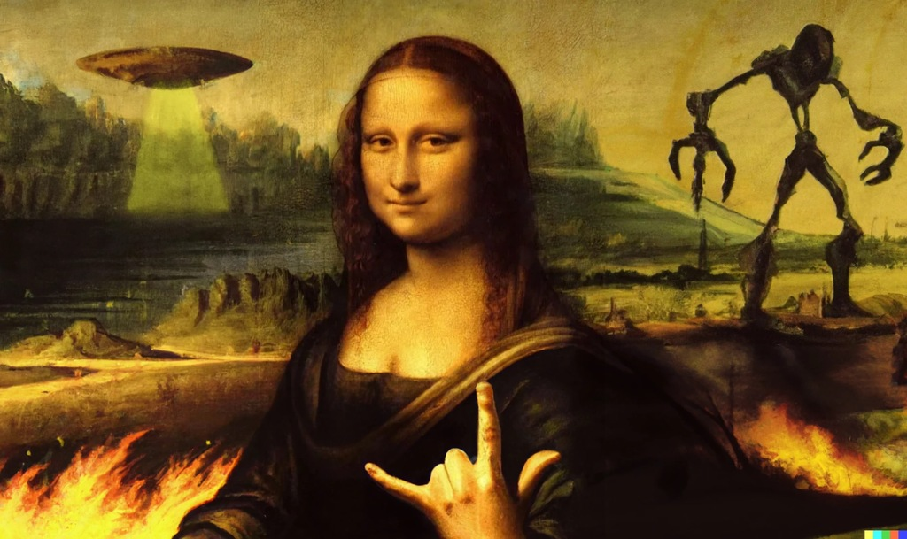 有了这一新功能,网友们纷纷进行了二次创作。有人对《蒙娜丽莎》进行了一番脑补:末日下的蒙娜丽莎。一番创作下来,背景中出现了飞碟、火苗、骷髅…… 还真有种末日到来的感觉。