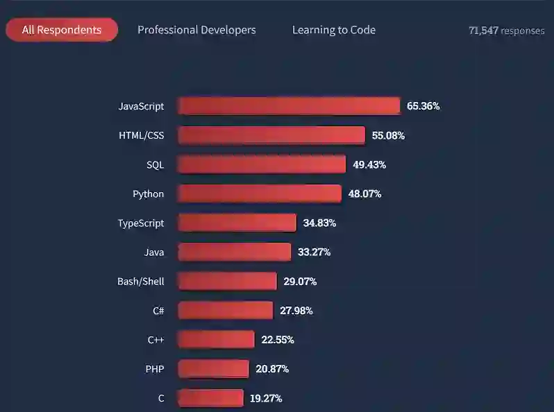 超过 65% 的开发人员使用 JavaScript,远远超过排在第二位的 Python
