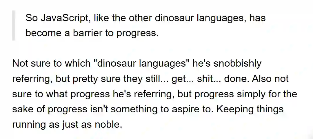 还有人表示不确定 Crockford 说的其他化石语言指的哪些,更不确定他说的进步又是什么。但是,