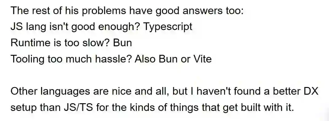 。JavaScript 不够好?用 TypeScript;运行时太慢?用 Bun;工具太麻烦?用 Bun 或 Vite。其他语言也很好,但对于使用它构建各种东西,并没有比 JS/TS 更好的 DX 设置。