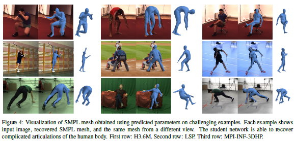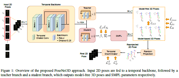 从二维关节中恢复三维人体姿态是一个高度无约束的问题。本文作者提出了一种新的神经网络框架PoseNet3D,其以2D关节点作为输入,输出3D骨架和SMPL人体模型的参数。作者使用了学生-老师框架,从而避免了在训练过程中使用3D数据如配对/未配对的3D数据、动捕数据、深度图或者多视角图像等等。作者首先使用2D人体关键点训练了一个教师网络输出3D人体骨架,教师网络将其知识提取到学生网络中,然后学生网络预测基于SMPL人体模型表达的3D人体姿态。