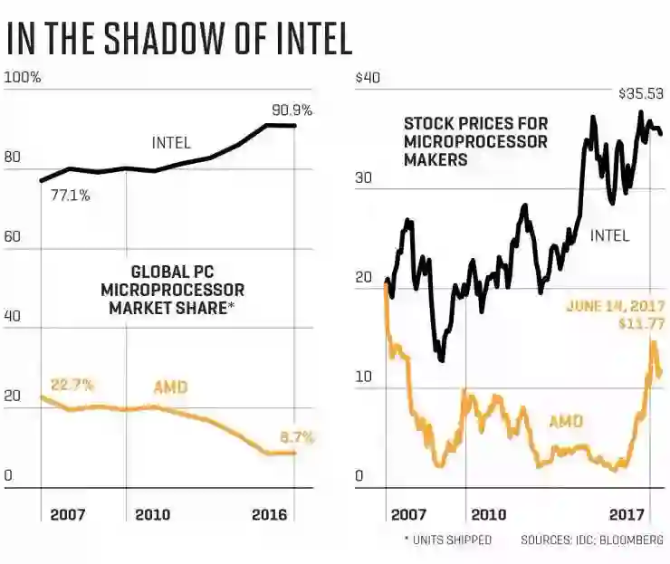英特尔和 AMD 的市占率变化以及股价捆绑关系