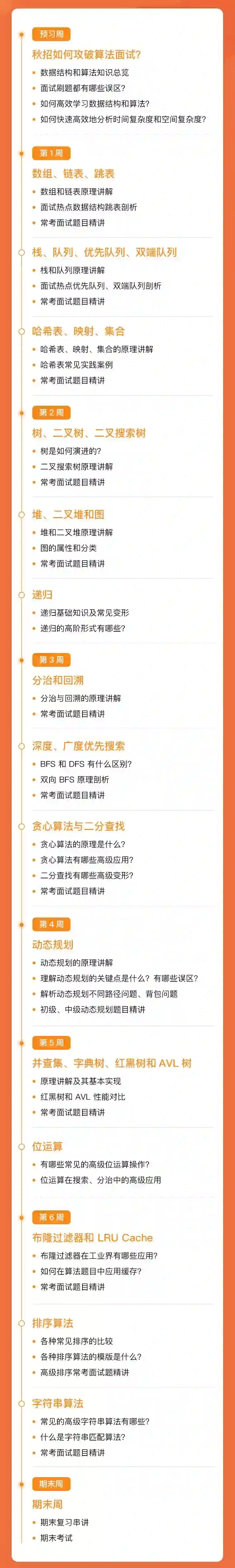 7 周录播教学 + 6 场直播指导 + 1v1 简历辅导 + 1v1 助教答疑 + 毕业名企内推 + 班主任学习追踪 + 社群班级联结,手把手带你搞定算法面试,斩获大厂 Offer。
