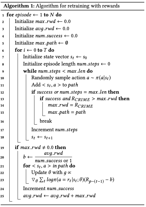 训练SafeRoute也分为两部分:监督训练和用奖励进行重复训练。在最初不使用监督训练的情况下,智能体在找寻目标节点时很困难,最终可能会随意寻找方向。AlphaGo在训练时用了模拟学习的方法,让智能体在最初能够找到正确方法。同样,我们也在训练开始时用监督学习进行模拟学习。经过监督学习之后,智能体还会再次训练,避开犯罪率高的区域。再次训练的算法过程如下: