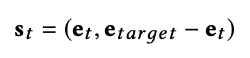 在我们的模型中,智能体的状态表示目前在地图上的位置以及目标位置。如果目标位置和此前训练时的目标位置很接近,那么智能体会采取相似行动靠近该目标。为了表示状态,地图信息被转换成有节点和线条的图,其中图嵌入用来表示强化学习智能体的连续状态,这些嵌入用node2vec来生成。用图嵌入而不用坐标的原因是,坐标不能体现地图上的交互是如何连接的任何信息。状态从智能体目前的节点和目标节点中使用的嵌入如下所示:
