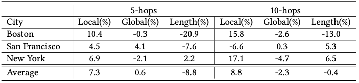 为了减少我们模型结果的多样性,我们为每个城市创建了三种模型,并对结果进行了平均。下表表现了SafeRoute和SafePath最安全的路线相比,增加或减少的百分比。