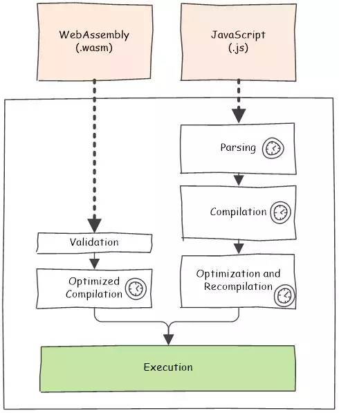 WebAssembly 既是 asm.js 的接班人,同时又是一项截然不同的技术。它是一种紧凑的二进制代码格式。与 asm.js 一样,WebAssembly 代码也被输入到 JavaScript 执行环境中。它们俩具有相同的沙箱和相同的运行时环境。与 asm.js 一样,WebAssembly 的编译方式使得更进一步的效率提升成为可能。但是现在的效率就已经比以前快多了了,浏览器可以完全跳过 JavaScript 解析阶段。对于一个普通的逻辑位来说(例如,耗时的计算),WebAssembly 的速度远远快于常规的 JavaScript,几乎与本机编译的代码一样快。