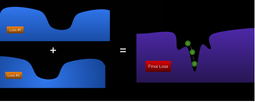 这次,可以将训练过程可视化为将两种地形(两个损失函数)加在一起以获得一个新的地形(最终损失函数),然后执行梯度下降。