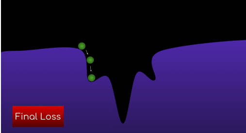 训练过程(梯度下降)可以看成是滚下山坡的球:这里的地形是损失函数(也称为成本/误差函数),球的位置代表所有参数的当前值(权重和偏差)。