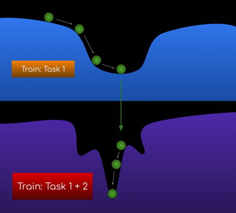 这是受人类启发的,因为我们是逐步学习而不是一次学习多个任务。之所以行之有效,是因为如果达到任务1的全局最小值,那么将两个损失函数加在一起时,与使用完全随机参数开始时相比,更有可能获得全局最小值(图3)。
