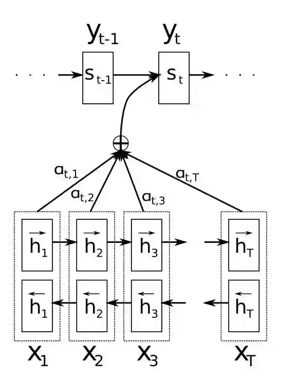 从而得到背景向量 (context),后面就没什么变化了,y_t 基于 s_{t-1}, y_{t-1} 和 context 来生成。