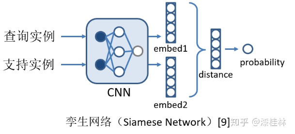 Koch提出的孪生网络的思想则是利用CNN网络学习每一个实例的表示,并通过计算查询实例和每一个支持实例的距离来判断所属的类别。同样被应用于关系抽取任务中,如图5所示。