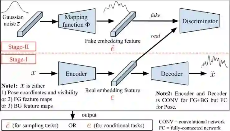 该论文提出了一种分阶段学习方法。在第一阶段,通过包含编码器、解码器的重构网络来学习三种弱相关人体图像特征,即前景、背景和姿态。在第二阶段,则将之前训练好的编码器、解码器固定,通过对抗式学习来分别训练三个映射函数,来将高斯空间分别映射到三个特征空间。在测试阶段采样时,我们可以先通过第二阶段学习到的映射函数来将高斯噪声映射到特征空间,然后利用第一阶段学习到的解码器将特征解码成图像。相比于直接将高斯空间映射到图像空间,这种两阶段映射降低了映射难度:相比于图像空间,特征空间的分布更加接近于图像数据,因此可以更容易通过对抗学习得到映射函数。此外,第二阶段的映射函数可以在第一阶段训练完成后进行,并不需要对第一阶段的特征空间加任何假设,因此可以应用于任何高斯空间到图像特征空间的映射。