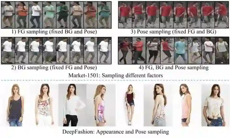 如图 4 所示,该模型在 128x64 分辨率的行人重识别数据库 Market-1501 和 256x256 分辨率的时尚数据库 DeepFashion 上进行了测试。我们可以看到在 Market-1501 上,该模型可以通过固定两个因素(如,背景和姿态)对应的高斯噪声输入来单独修改剩余的一种(如,前景),或者同时采样三种因素的噪声生成三种因素截然不同的图像。在 DeepFashion 上,该模型则可用于从高斯空间采样出新的衣服样式(前景)。