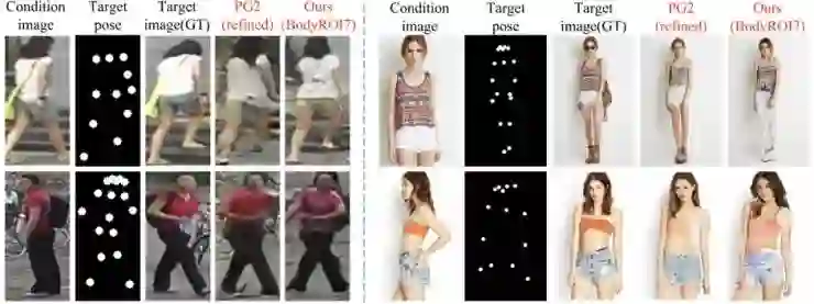 图 7. 姿态指导的人体图像生成可视化结果对比。