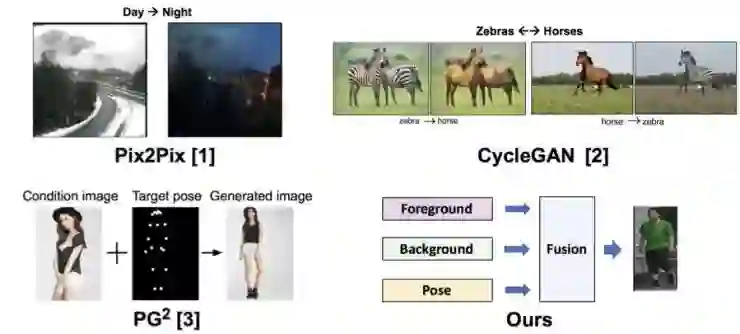 在之前的图像转换工作中(图 1),CVPR17 的 pix2pix [1] 通过使用带监督信息的训练数据来学习一个可以进行外观转换的 image-to-image 模型。之后,ICCV17 的 cycleGAN [2] 提出使用 cycle-consistency 的约束使得无监督学习 image-to-image 模型成为可能。以上两个主流的模型主要针对图像的外观信息进行迁移,而没有进行结构信息的迁移。我们 NIPS17 的工作 PG2 [3] 则可以通过将人体姿态关节点和图像一起作为网络输入,然后利用有监督学习对人体图像进行结构信息的迁移。为了同时进行外观和结构信息的迁移,我们将人体图片分解为前景、背景、姿态三个弱相关因素,从而可以单独控制各个因素。此外,我们还提出一种「高斯噪声-> 特征 ->图像」的映射方式,使得模型可以分别从高斯空间采样得到对应的前景、背景、姿态。该论文采用自监督的方式来训练模型,因此不需要带监督信息的训练数据。总结来讲,模型有如下优点: