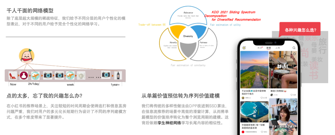 在推荐场景中,关注较短的时间周期会使得追打和信息茧房问题严重,小红书技术团队对用户的多元化长短期行为设计了不同的序列建模方式,在多个维度带来了显著提升。此外,关于内容推荐的多样性问题,小红书技术团队将传统的多样性做法从 DPP 改进到 SSD 算法,在信息流推荐的场景中高效地滑窗计算,从而将单篇模型的价值排序转化为整个浏览周期的建模。这背后依赖的是孪生神经网络学习长尾内容的相似性。小红书技术团队的相关工作成果已经发表在 KDD 2021 会议上。