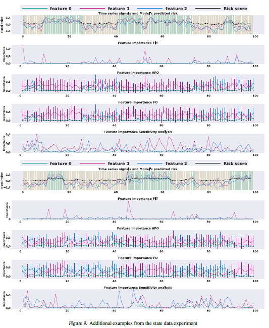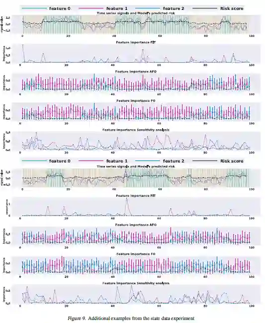 (1)本文将得到的重要度度量,和基于梯度的解释,注意力机制以及其他基准在模拟和临床ICU数据的结果进行了比较,说明了本文的方法可以生成最精确的结果(2)同时,本模型还具有价格低廉,通用的特点(3)并且可以使用在任意复杂时间序列模型和预测器中(4)最后,本文提出的设计是唯一一个对时间序列中每一个特征都可以确定其重要时间点的方法。