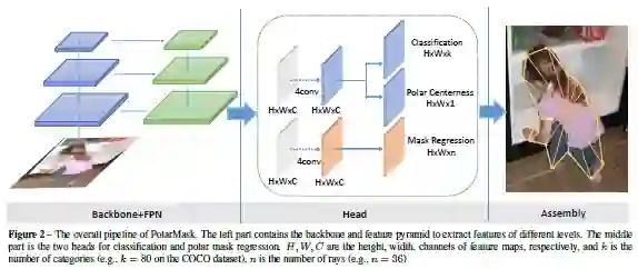 在本文中,作者介绍了一种新的单实例分割方法——PolarMask,该方法完全卷积且网络结构简单,可以最大限度的将其嵌入到大多数现成的检测方法中使用。通过PolarMask方法可以将实例分割问题转化为研究中心分类和极坐标距离回归的轮廓预测问题。此外,作者还对处理高质量采样的中心示例和密集距离回归优化进行了探索,发现采用该方法可以显着提高性能并简化训练过程。最后作者通过实验证明了提出的PolarMask框架在实例分割任务中是明显优于其他的方法。