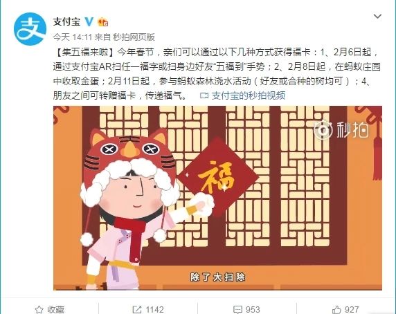 支付宝推春节“集五福”活动:四种方式可获得福卡