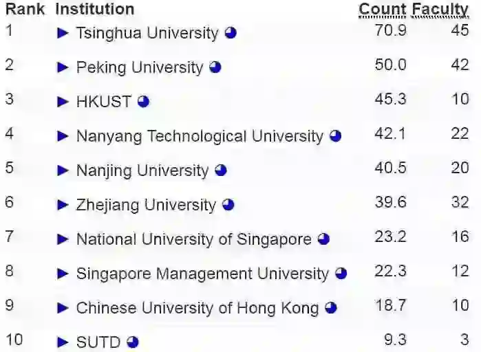 目前,卡耐基梅隆大学(CMU)、麻省理工学院(MIT)与斯坦福大学名列全球前三,清华大学位列第13名,北京大学第30名,上海交通大学此次排行第48名。