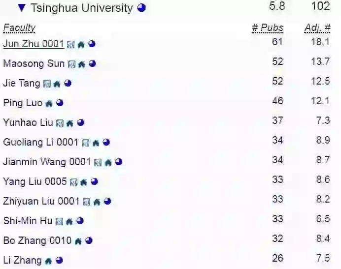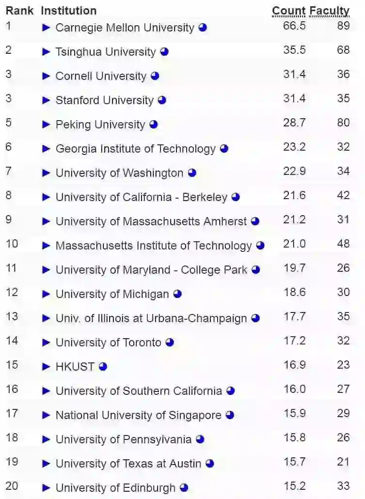 如果只考虑 AI 部分的排名,排名第一的是卡内基梅隆大学(CMU),清华大学排名第二,康奈尔大学和斯坦福大学并列第3;第5到第10名分别为:北京大学、 佐治亚理工学院、华盛顿大学、加州大学伯克利分校、马萨诸塞大学安姆斯特分校、麻省理工学院