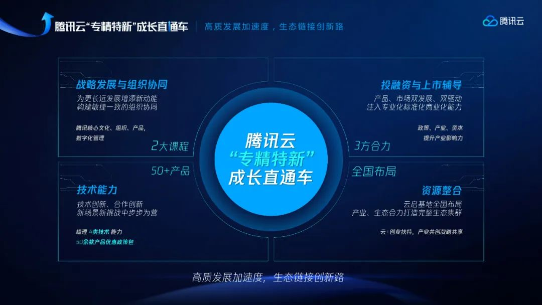 为了响应国家发展专精特新的战略,腾讯云也专门推出了“专精特新”成长直通车计划,从战略发展与组织协同、投融资与上市辅导、技术能力、资源整合四个方面来助力我们专精特新企业的快速发展。同时开放4大类技术能力和50多款数字化产品,为企业技术创新提供低门槛工具;整合产业、生态的全方位资源,全面助力中小企业加速发展。