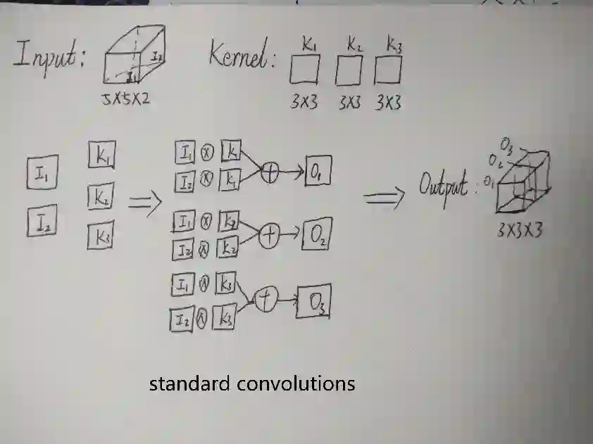 Standard 过程如下图,X 表示卷积,+表示对应像素点相加,可以看到对于 O1 来说,其与输入的每一个 feature map 都「发生关系」,包含输入的各个 feature map 的信息。
