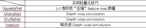 在此列出表格,对比四种网络是如何达到网络轻量化的。