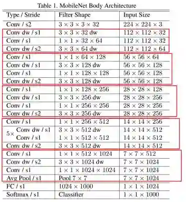 看看 MobileNet 的网络结构,MobileNet 共 28 层,可以发现这里下采样的方式没有采用池化层,而是利用 depth-wise convolution 的时候将步长设置为 2,达到下采样的目的。