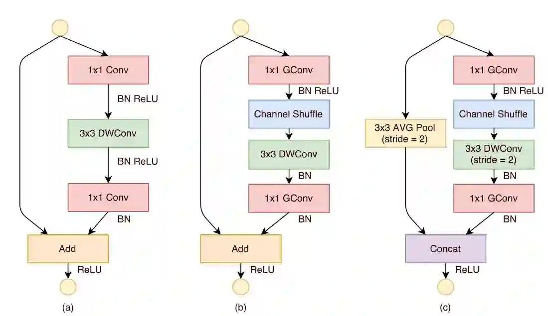 图 (b):作者在 (a) 的基础上进行变化,对 1*1 conv 换成 1*1 Gconv,并在第一个 1*1 Gconv 之后增加一个 channel shuffle 操作;