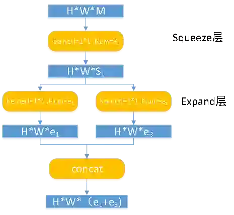 Fire module 输入的 feature map 为 H*W*M 的,输出的 feature map 为 H*M*(e1+e3),可以看到 feature map 的分辨率是不变的,变的仅是维数,也就是通道数,这一点和 VGG 的思想一致。