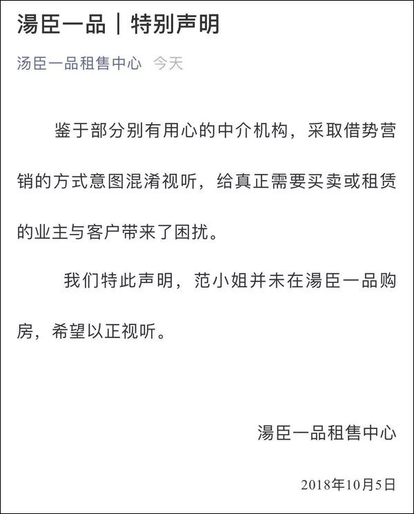 汤臣一品:范冰冰没买我们的房子,中介借势营销混淆视听