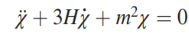 这是一个2阶的常微分方程,刻画的是带有阻力的弹簧的振动方程,其中带哈勃参数H的那一项表示阻尼。如果H很大,相当于阻尼很大,这时标量场(相当于弹簧)是振荡不起来的,因此不能产生暗物质。从前面介绍的拉格朗日量可以看出,如果场随着时间变化,导数就比较大,这就好比在一个湖面上,如果有波动,就容易产生水花;但如果湖面是静止的,即使湖面的水位很高、势能很大,也不会有水花。