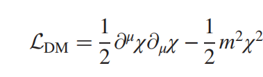在这里,等式右侧的前半部分表示动能,后半部分表示势能。动能项中含有场对时间的导数,因此当场随着时间变化时,这部分能量就很大,容易产生暗物质粒子。而势能项中,m表示这个暗物质场的质量(注意不是暗物质粒子的质量)。这个m是一个可调的参数,在腾卡能的论文中,这个参数尤其重要。