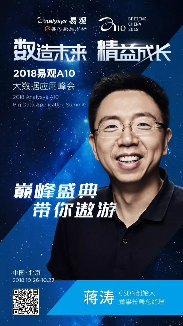 2018年10月26-27日,易观A10大数据应用峰会将于北京召开,CSDN创始人蒋涛,这位中国最大的开发者社区创始人将会莅临现场,为我们带来他关于大数据时代的独到思考。