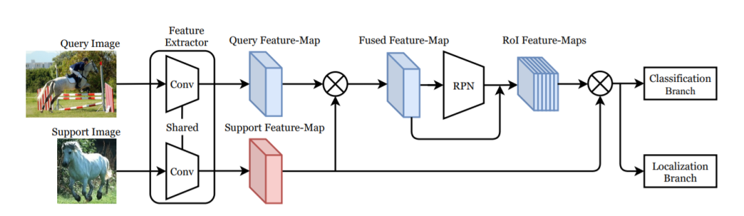 整体框架的单样本目标检测方法,其中基于Faster R-CNN框架。该模型以查询图像和支持图像为输入,使用连体卷积特征提取器提取查询特征图和支持特征图。然后利用整体特征聚合将两个特征图聚合成一个融合的特征图,并将其转发到RPN和RoI层,分别生成区域建议和RoI特征。在不同的OSOD方法中,聚合方式的实现是不同的。最后将RoI特征用于分类任务和定位任务。一些方法还应用RoI特征聚合来聚合RoI特征和支持特征。